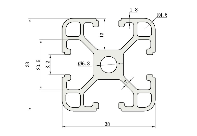適用于應(yīng)力及強(qiáng)度較大的框架組合結(jié)構(gòu),它的外型采用圓角過渡,表面經(jīng)過陽(yáng)極氧化處理,高雅美觀并抗腐蝕,它通常采用M8X20高強(qiáng)度專用螺栓加彈性扣件的內(nèi)部連接方式,堅(jiān)固而又可靠,是工業(yè)框架應(yīng)用較為廣泛的型材之一。